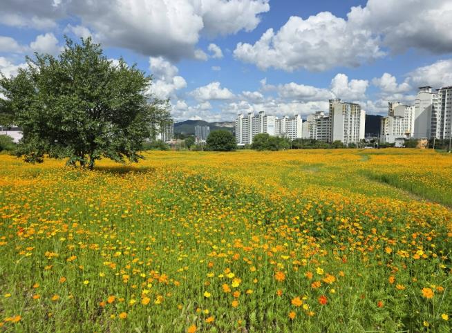 포천동 왕방공원은 올해 봄, 시민들에게 화사한 계절 풍경을 제공하기 위해 2만6,446㎡ 규모의 유휴부지를 정비하고 1만9,834㎡에 달하는 유채꽃 단지와 산책로를 조성한 바 있다. 이후 7월 토지를 재정비해 새로운 계절을 맞이할 준비를 마쳤으며, 현재는 지난여름 유채꽃을 정리한 자리에 심은 황화 코스모스가 노랗게 물들어 바람에 흔들리며 도심 한복판을 가을 정취로 물들이고 있다.