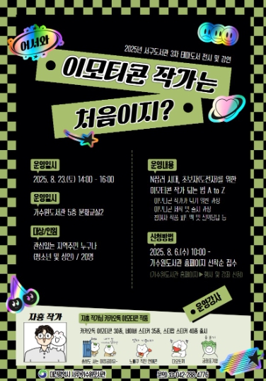 ‘테마 강연’은 8월 23일 오후 2시부터 4시까지 가수원도서관 5층의 2번 문화 교실에서 진행된다. 강연에는 현직 이모티콘 작가 ‘자홍’이 초청돼 초보자를 위한 이모티콘 작가 입문 방법을 설명하고, 참여자의 작품에 대한 피드백과 질의응답도 진행할 예정이다.