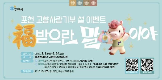 포천시 관계자는 “이번 이벤트가 고향사랑기부제에 대한 시민 관심을 높이고, 새해 소망을 함께 나누는 계기가 되길 바란다”며 “시민 모두가 따뜻하고 행복한 명절을 보내시길 기원한다”고 말했다.