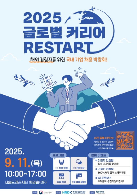 [뉴스노크=김인호 기자] 고용노동부와 한국산업인력공단은 대한무역투자진흥공사(KOTRA)와 협업하여 '025 글로벌 커리어 리스타트'채용박람회를 11일 서울드래곤시티 한라홀(서울 용산구)에서 개최한다.