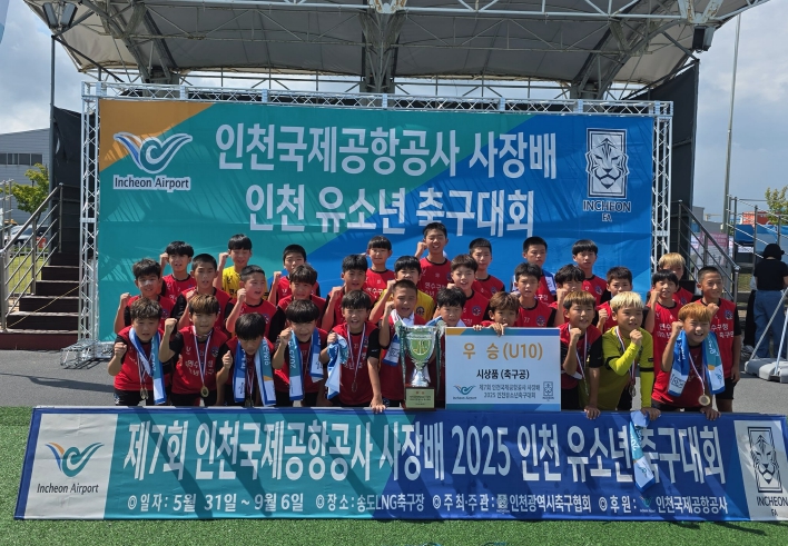 [뉴스노크=김인호 기자] 연수구청 유소년축구단(단장 이재호)이 제7회 인천국제공항공사 사장 배 인천 유소년 축구대회에서 10세 이하(U-10) 부문 우승을 차지했다.