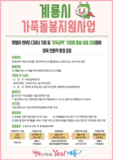 [뉴스노크=김인호 기자] 계룡시는 조부모 등 4촌 이내 친인척이 부모를 대신해 2~3세 영유아를 월 40시간 이상 돌봄을 제공할 경우 아이 1명당 월 30만원의 가족돌봄수당을 지급하는 ‘계룡시 가족돌봄지원 사업’을 11월 본격 시행한다고 밝혔다.