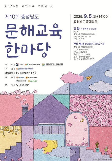 행사에서는 전국 및 충남 문해교육 시화전 출품작 168점 전시와 ▲우수 시화작품 시상 및 낭송 ▲문해교사 시상 ▲학습자 학습활동 영상 상영 ▲공연 및 체험존 운영 등 다채로운 프로그램이 진행된다.