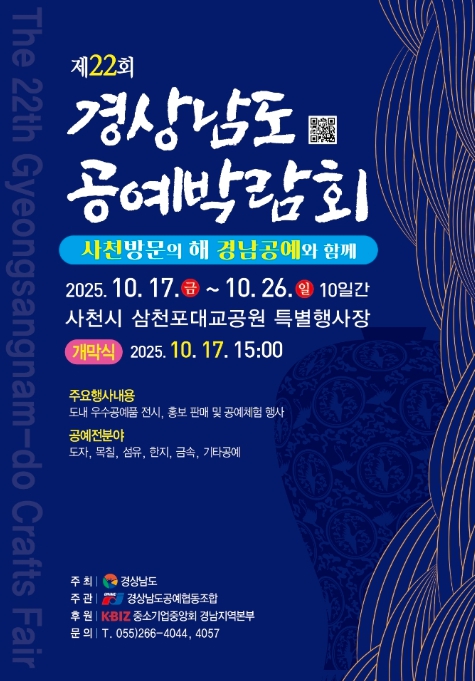 [뉴스노크=김인호 기자] 경상남도는 10월 17일부터 26일까지 10일간 사천시 삼천포대교공원 특별행사장에서 ‘제22회 경남 공예박람회’를 개최한다고 밝혔다.