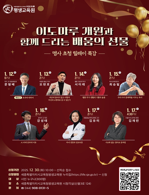 [뉴스노크=김인호 기자] 세종특별자치시교육청평생교육원(원장 송정순)은 2026년 1월 개원을 기념해 1월 12일부터 17일까지 6일간 개원 주간을 운영하고, 개원 행사의 일환으로 ‘명사 초청 릴레이 특강’을 매일 개최한다.