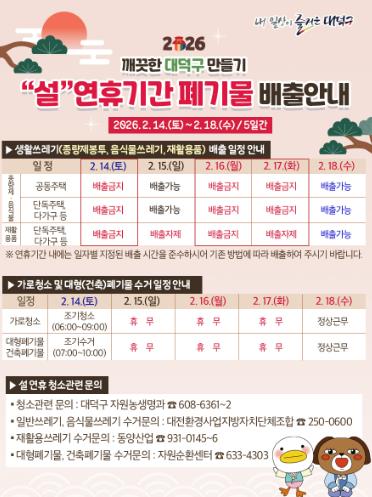 한편, 구는 설 연휴 생활 쓰레기 수거 일정을 대덕구 누리집, 카드뉴스, 네이버 블로그․밴드 등을 활용해 사전 홍보하며 각 가정에서 쓰레기 배출로 인한 불편이 발생하지 않도록 안내에 나서고 있다.