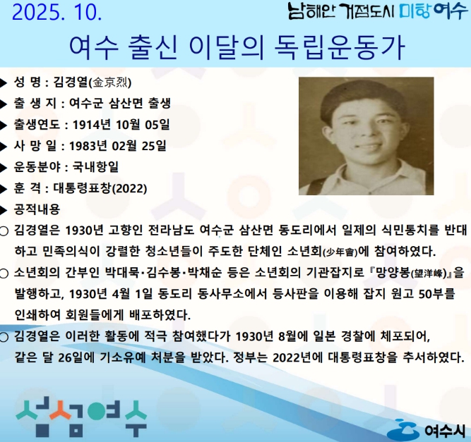 [뉴스노크=김인호 기자] 여수시는 2025년 10월의 독립운동가로 전라남도 여수군 삼산면 출신의 ‘김경열(金京烈)’ 선생을 선정했다.