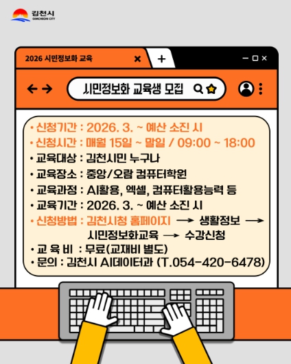 [뉴스노크=김인호 기자] 김천시는 시민들의 디지털 역량 강화를 위한 ‘2026년 시민 정보화교육’을 오는 3월부터 운영한다고 밝혔다.