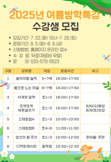 [뉴스노크=김인호 기자] 삼척교육문화관은 8월 5일부터 8일까지 유아․초등학생을 대상으로 2025년 여름방학특강을 운영한다.