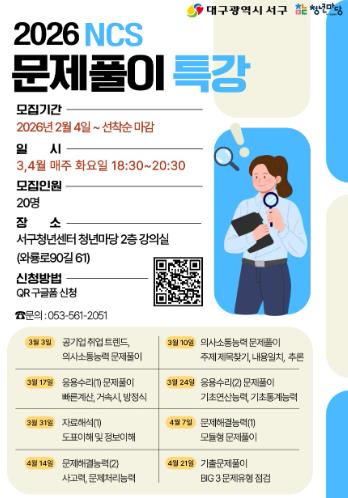 [뉴스노크=김인호 기자] 대구 서구는 관내 청년들의 취업 경쟁력 강화를 위하여 서구청년센터 청년마당 강의실에서 NCS(국가 직무능력 표준) 문제 풀이 특강 참여자를 모집한다고 밝혔다.