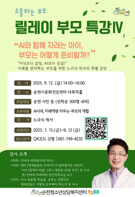 [뉴스노크=김인호 기자] 순천시는 오는 9월 12일 오후 2시, 순천시문화건강센터 다목적홀에서 순천시민을 대상으로 노규식 박사 초청 부모 특강을 개최한다고 밝혔다.