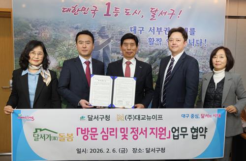 [뉴스노크=김인호 기자] 대구 달서구는 지난 6일, 2026년 ‘지역사회 통합돌봄’ 본사업의 성공적인 시행을 위해 어르신 심리·정서(인지) 케어 전문기관인 대교뉴이프와 업무협약을 체결하고,‘달서형 지역특화 통합돌봄 사업’을 선제적으로 추진한다.