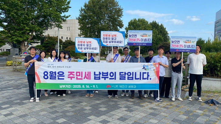[뉴스노크=김인호 기자] 전주시는 25일 오전 완산구 선너머네거리와 덕진구 진북광장사거리 일원에서 8월 정기분 주민세 납부의 달을 맞아 시민들에게 납부 기한을 널리 알리고 성실납세 분위기를 조성하기 위한 거리 홍보 캠페인을 전개했다.