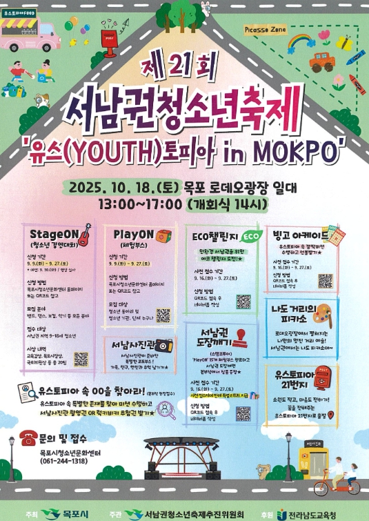 [뉴스노크=김인호 기자] 제21회 서남권청소년축제가 ‘유스(YOUTH)토피아 in MOKPO’를 주제로 오는 10월 18일(토) 오후 1시부터 5시까지 목포 로데오광장 일대에서 열린다.
