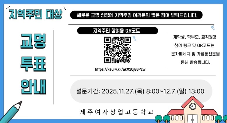 [뉴스노크=김인호 기자] 제주도교육청 제주여자상업고등학교는 2027학년도 일반고(남녀공학) 전환에 따라 실시한 학교명 공모 결과를 심사해 최종 3개 후보를 선정하고 이에 대한 온라인 설문조사를 27일부터 내달 7일까지 진행한다.