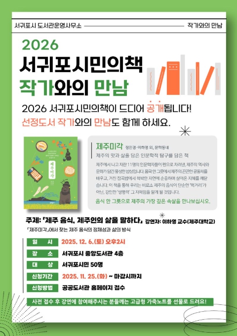[뉴스노크=김인호 기자] 서귀포시는 12월 6일 오후 2시, 서귀포시 중앙도서관에서 2026년 서귀포시민의 책으로 선정된 '제주미각'의 저자 이하영 교수를 초청해 작가와의 만남을 운영한다.