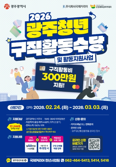 [뉴스노크=김인호 기자] 광주광역시는 미취업 청년의 안정적인 취업 준비를 지원하기 위해 ‘2026년 광주 청년 구직활동수당 지원’ 2차 참여자 1147명을 오는 3월3일까지 모집한다.