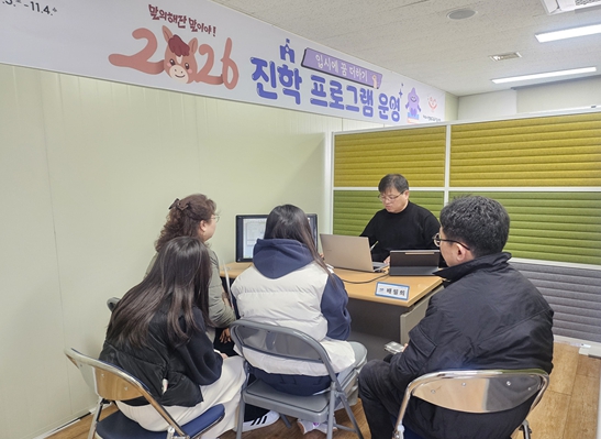 | ▲ 여수시가 마련한 ‘2026 예비 중3 맞춤형 1:1 진로·진학 컨설팅’에서 참여 학생과 학부모가 입시와 관련된 유익한 정보를 제공받고 있다. |