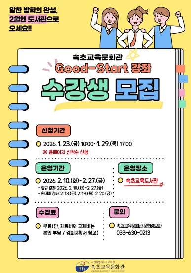 [뉴스노크=김인호 기자] 속초교육문화관(관장 이윤전)은 2월 10일부터 27까지 10일간 속초교육도서관에서 예비 초·중·고등학생, 초등 가족을 대상으로 ‘2026년 굿 스타트(Good-Start) 강좌’를 운영한다.