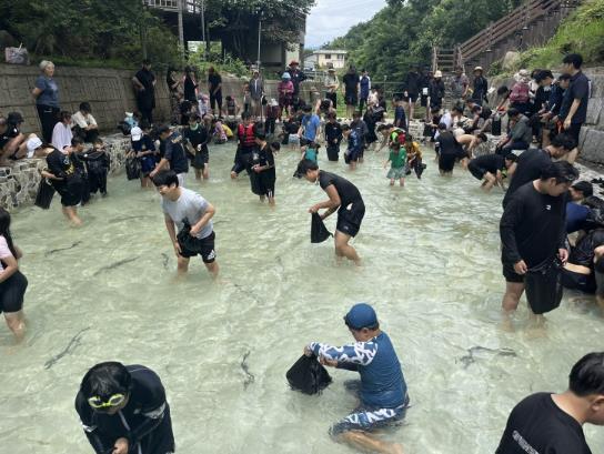 장어를 잡은 참가자는 ‘기운찬 천하장어’ 체험 운영 부스에서 초벌구이 장어로 교환해 현장에서 바로 맛볼 수도 있다.