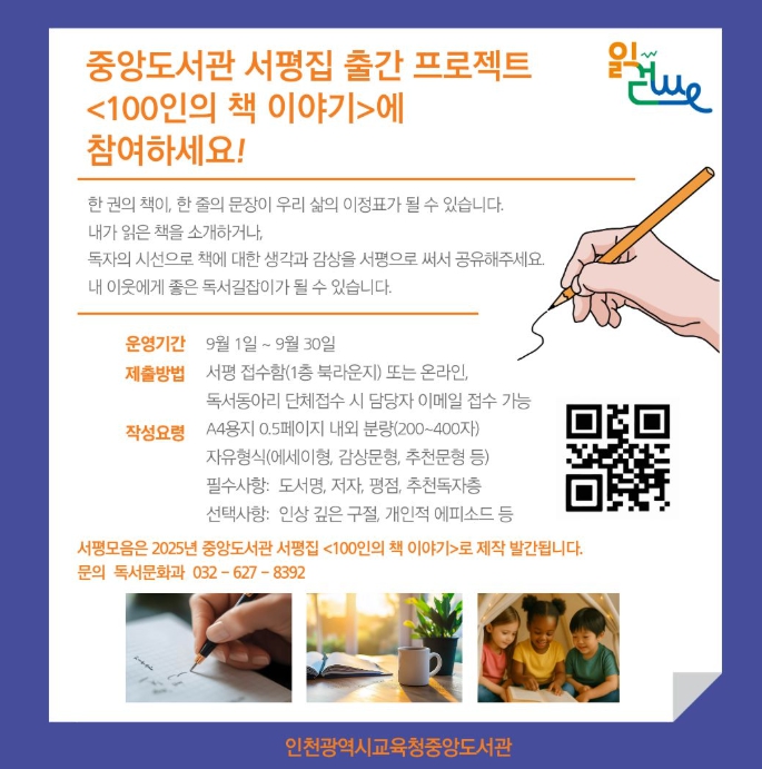 [뉴스노크=김인호 기자] 인천광역시교육청중앙도서관은 9월 독서의 달을 맞아 ‘100인의 책 이야기’ 서평집 출간 프로젝트를 진행한다.