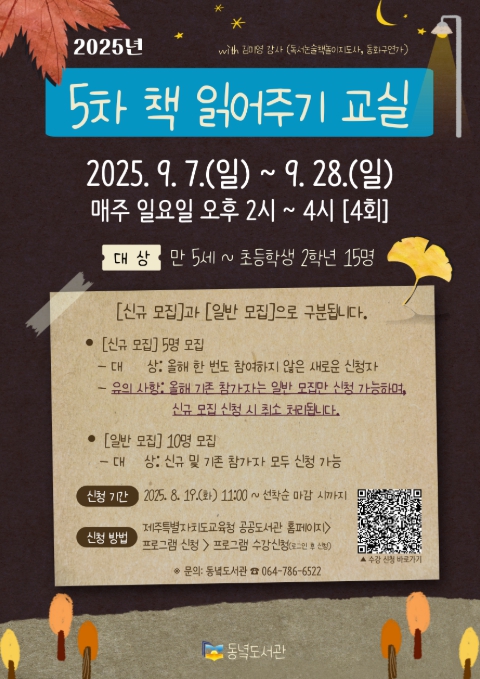 [뉴스노크=김인호 기자] 제주도교육청 동녘도서관은 9월 7일부터 28일까지 평생교육실에서 ‘2025년 5차 책 읽어주기 교실’을 운영한다.