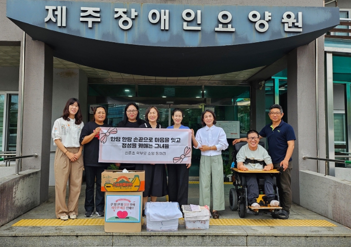 [뉴스노크=김인호 기자] 제주도교육청 신촌초등학교 보호자 재봉틀 동아리는 2일 1학기 동안 정성껏 만든 턱받이와 앞치마를 제주장애인요양원에 기부하며 따뜻한 나눔을 실천했다.