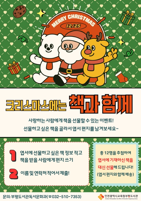 [뉴스노크=김인호 기자] 인천광역시교육청부평도서관은 지역 서점과 협력한 책동네산책 프로젝트의 일환으로 ‘크리스마스에는 책과 함께’ 이벤트를 12월 14일까지 운영한다고 밝혔다.