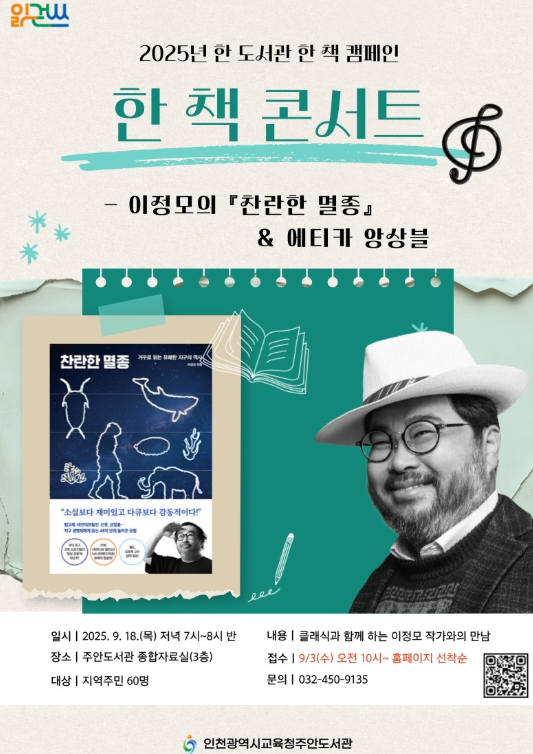 [뉴스노크=김인호 기자] 인천광역시교육청주안도서관은 2025년 한 도서관 한 책 캠페인의 일환으로 ‘한 책 콘서트-이정모의 찬란한 멸종 · 에티카 앙상블’을 오는 9월 18일 오후 7시에 운영한다.