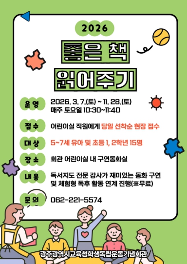 [뉴스노크=김인호 기자] 광주시교육청학생독립운동기념회관은 오는 3~11월 유아 및 초등학교 저학년 학생을 대상으로 독서 프로그램 ‘좋은 책 읽어주기’를 운영한다.