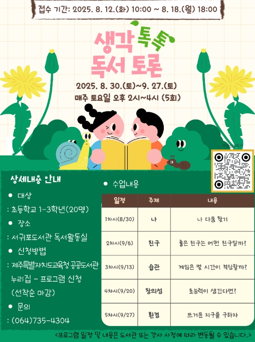 [뉴스노크=김인호 기자] 제주도교육청 서귀포도서관은 오는 30일부터 다음 달 27일까지 매주 토요일 오전 10시부터 12시까지 ‘생각 톡톡 독서 토론’ 프로그램을 운영한다.