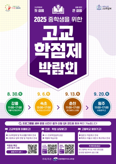 [뉴스노크=김인호 기자] 강원특별자치도교육청은 8월 30일 강릉 권역을 시작으로 4개 지역(강릉, 속초, 춘천, 원주)에서 “2025년 중학생을 위한 고교학점제 박람회”를 개최한다.