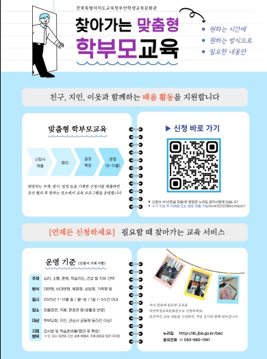 [뉴스노크=김인호 기자] 전북특별자치도교육청부안학생교육문화관(관장 박수진)은 학부모 주도의 자율적 학습 지원을 위한 ‘찾아가는 맞춤형 학부모교육’을 8월부터 12월까지 상시 접수·운영한다고 8일 밝혔다.
