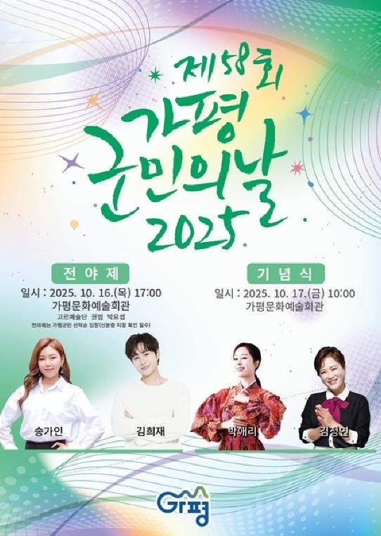 [뉴스노크=김인호 기자] 가평군은 오는 16일 오후 5시, 새롭게 리모델링을 마친 가평문화예술회관에서 ‘제58회 가평군민의 날 전야제’를 개최한다. 이번 행사는 ‘다시, 가평으로’를 슬로건으로 내세워 수해 극복과 지역 재도약을 기원하며 군민 화합의 의미를 담아 열린다.