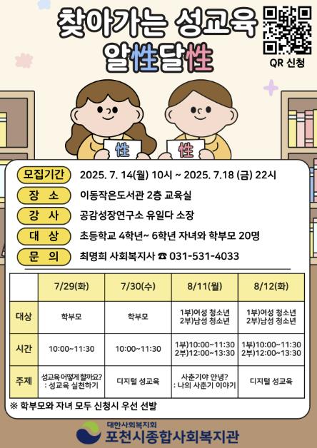 ‘알성달성’은 부모와 자녀가 함께 참여하는 찾아가는 성교육 프로그램으로, 오는 7월 29일부터 8월 12일까지 총 6회기에 걸쳐 이동도서관에서 진행된다. 성에 대한 올바른 이해를 바탕으로 건강한 가족 소통을 도모하기 위해 기획했다.