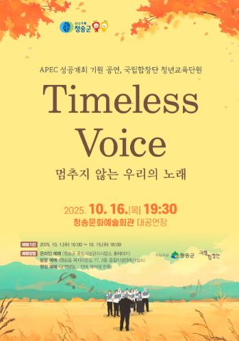 [뉴스노크=김인호 기자] 청송군은 오는 16일 저녁 7시 30분, 청송문화예술회관 대공연장에서 APEC 성공개최를 기원하는 국립합창단 청년교육단원 공연 ‘Timeless Voice – 멈추지 않는 우리의 노래’를 개최한다.