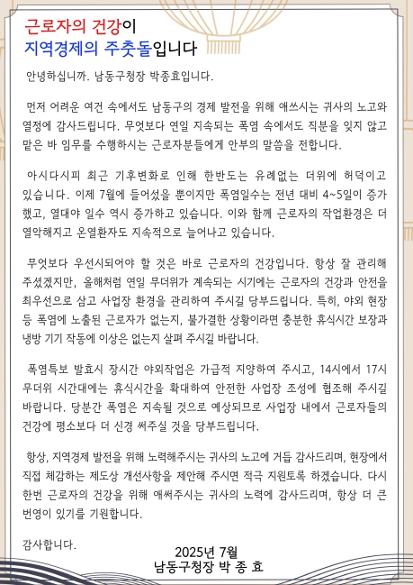 남동구는 이상고온이 과거보다 급격히 증가해 근로자의 안전이 중요한 시기라는 판단으로, 이번 서한문을 발송했다.
