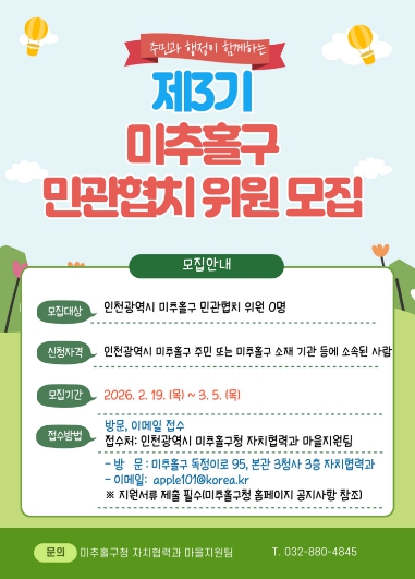 [뉴스노크=김인호 기자] 인천 미추홀구는 주민과 행정이 함께 지역 현안을 논의하고 해결하는 협치 기반을 강화하기 위해 제3기 민관협치위원회 위원을 공개 모집한다고 밝혔다.