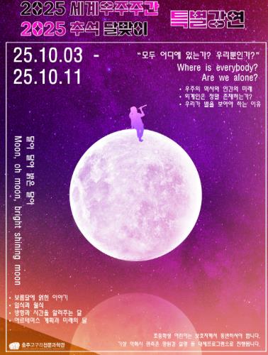 [뉴스노크=김인호 기자] 충주고구려천문과학관에서는 세계우주주간과 추석 한가위 연휴를 맞아 10월 3일부터 11일까지 특별 강연과 달맞이 관측 행사를 진행한다.