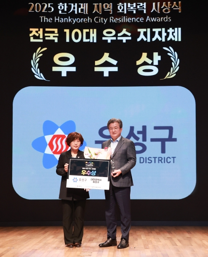 [뉴스노크=김인호 기자] 대전 유성구가 지난 23일 서울 중구 대한상공회의소 국제회의장에서 열린 '2025 한겨레 지역 회복력 평가' 시상식에서 전국 10대 우수 지방자치단체에 선정됐다.