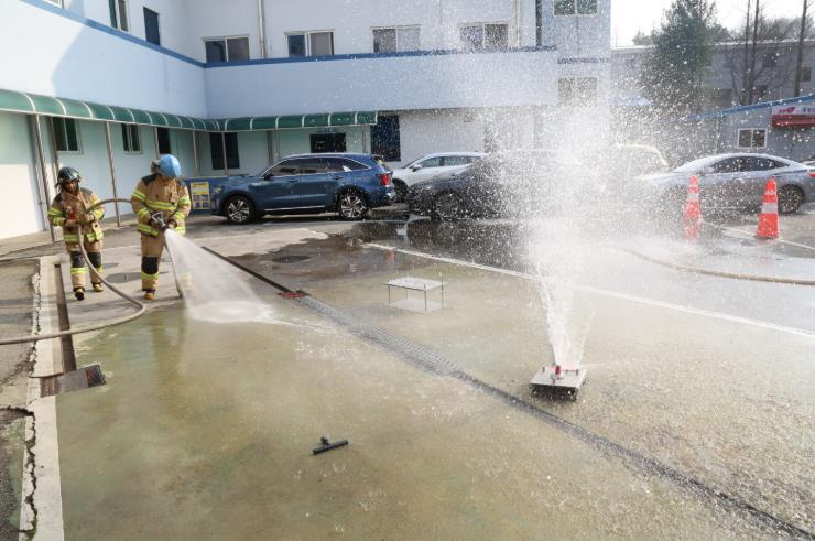 이번 훈련에서는 전기차 배터리 화재 시 고온이 장시간 지속되는 특성을 고려해, 배터리 팩이 위치한 하부를 직접 관통해 냉각할 수 있는 드릴렌스 관창 장비 운용법을 중점적으로 실습했다.