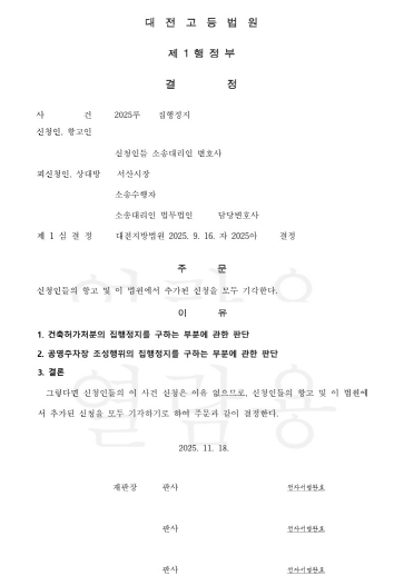 [뉴스노크=김인호 기자] 충남 서산시가 추진하는 예천지구 공영주차장(초록광장) 조성사업과 관련하여 일부 시민이 제기한 건축허가처분 집행정지 항고에 대해 대전고등법원이 18일 기각 결정을 내렸다.