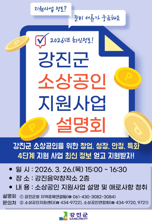 [뉴스노크=김인호 기자] 강진군이 오는 26일 강진군 음악창작소 2층에서 현장에서 바로 활용할 수 있는 실질적인 지원정보를 제공하고 소상공인의 애로사항을 직접 청취하기 위한 ‘2026년 소상공인 지원사업 설명회’를 개최한다.