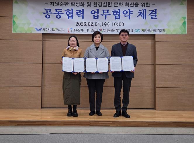 [뉴스노크=김인호 기자] 충주시시설관리공단은 지난 4일 충주문화시니어클럽, 업싸이클&자원순환 환경센터와 함께 자원순환 확대와 ESG 경영 실천을 위한 상호협력 협약을 체결했다고 밝혔다.