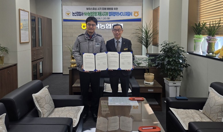 [뉴스노크=김인호 기자] 2026. 1. 20. 논산경찰서(서장 여상봉)는 국민은행 논산지점 및 농협 계룡시지부와 함께 날로 지능화하는 보이스피싱 범죄에 공동 대응하기 위한 업무협약을 체결했다고 밝혔다.