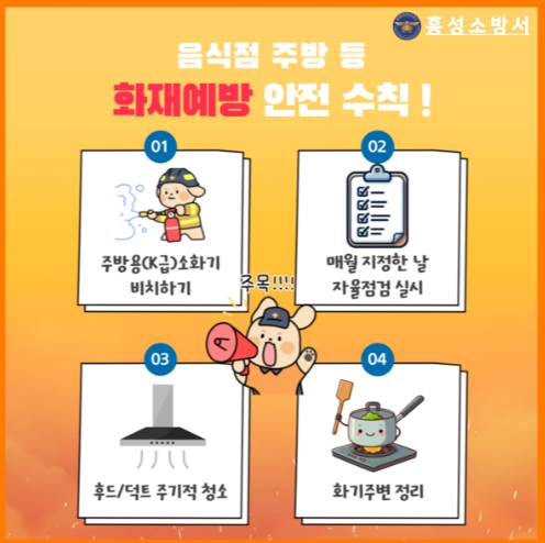 홍성소방서 이동우 서장은 “주방은 열과 기름이 항상 공존하는 고위험 공간인 만큼 평소 안전수칙을 생활화하는 것이 무엇보다 중요하다”며 “업주와 종사자 모두 자율 안전점검을 강화해 화재 없는 안전한 영업환경을 조성해 달라”고 말했다.