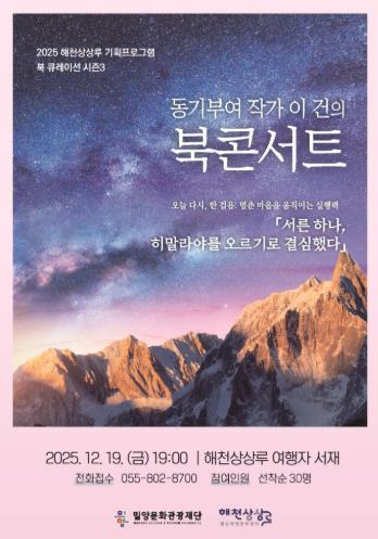 [뉴스노크=김인호 기자] 밀양문화관광재단은 오는 19일 오후 7시 해천상상루 여행자 서재에서 밀양여행문화센터 기획프로그램 ‘2025 북 큐레이션’ 네 번째 북 콘서트를 개최한다.