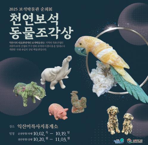 [뉴스노크=김인호 기자] 익산시 보석박물관은 추석 연휴가 시작되는 10월 2일부터 11월 3일까지 익산미륵사지휴게소(양방향)에서 '천연보석 동물조각상' 순회전시를 진행한다.