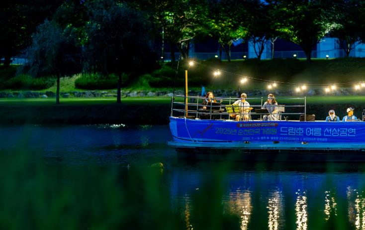 지난 7월 첫주부터, 주말 저녁 8시 전후 순천시 동천변 그린아일랜드 구간에 수상퍼레이드를 마친 형형색색의 선박들이 항로를 벗어나 강변으로 모여 약 20분간의 짧은 공연을 선보이고 있다.