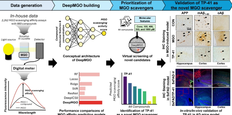 해당 모델을 활용한 AI 스크리닝으로 연구팀은 기존 트립토판 계열 물질보다 혈뇌장벽(BBB) 투과율이 우수한 신규 유도체 ‘TP-41’을 발굴하는 데 성공했다. TP-41은 MGO를 직접 소거하는 기전을 통해 독성을 낮추고, 뇌로의 전달 효율을 높인 것이 특징이다.